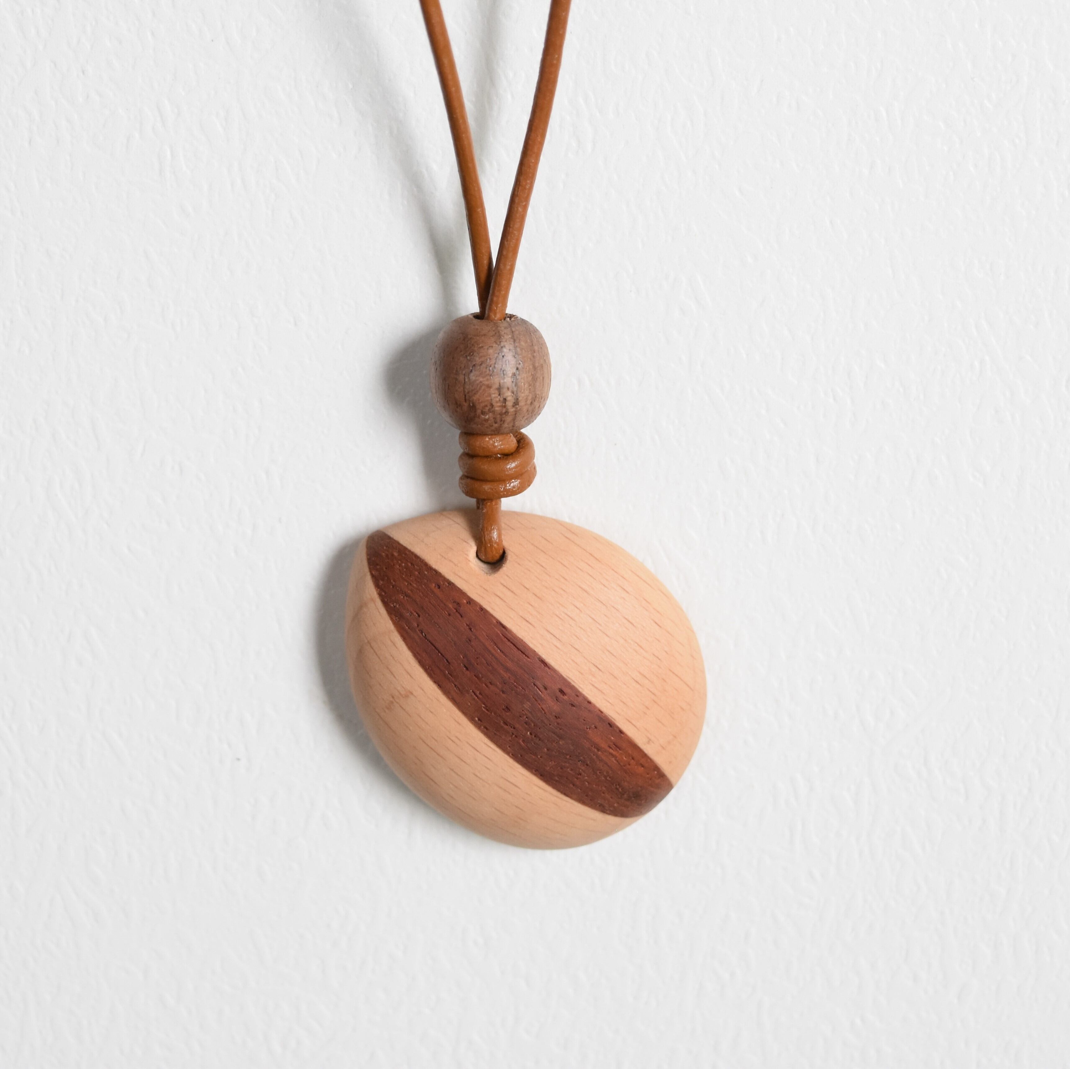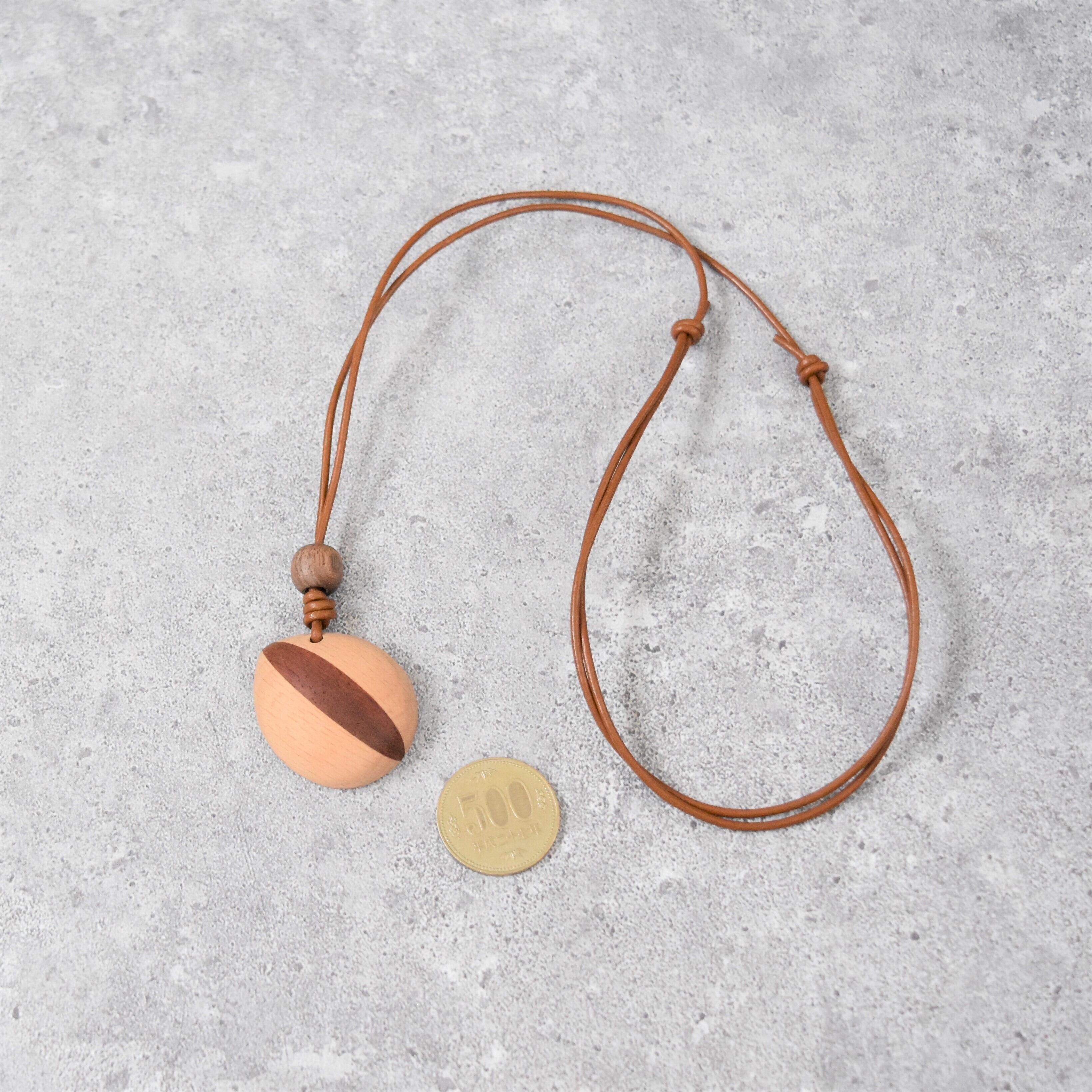 ペンダントトップは木の実をイメージした形で、色の違う木を挟んで接着しています。