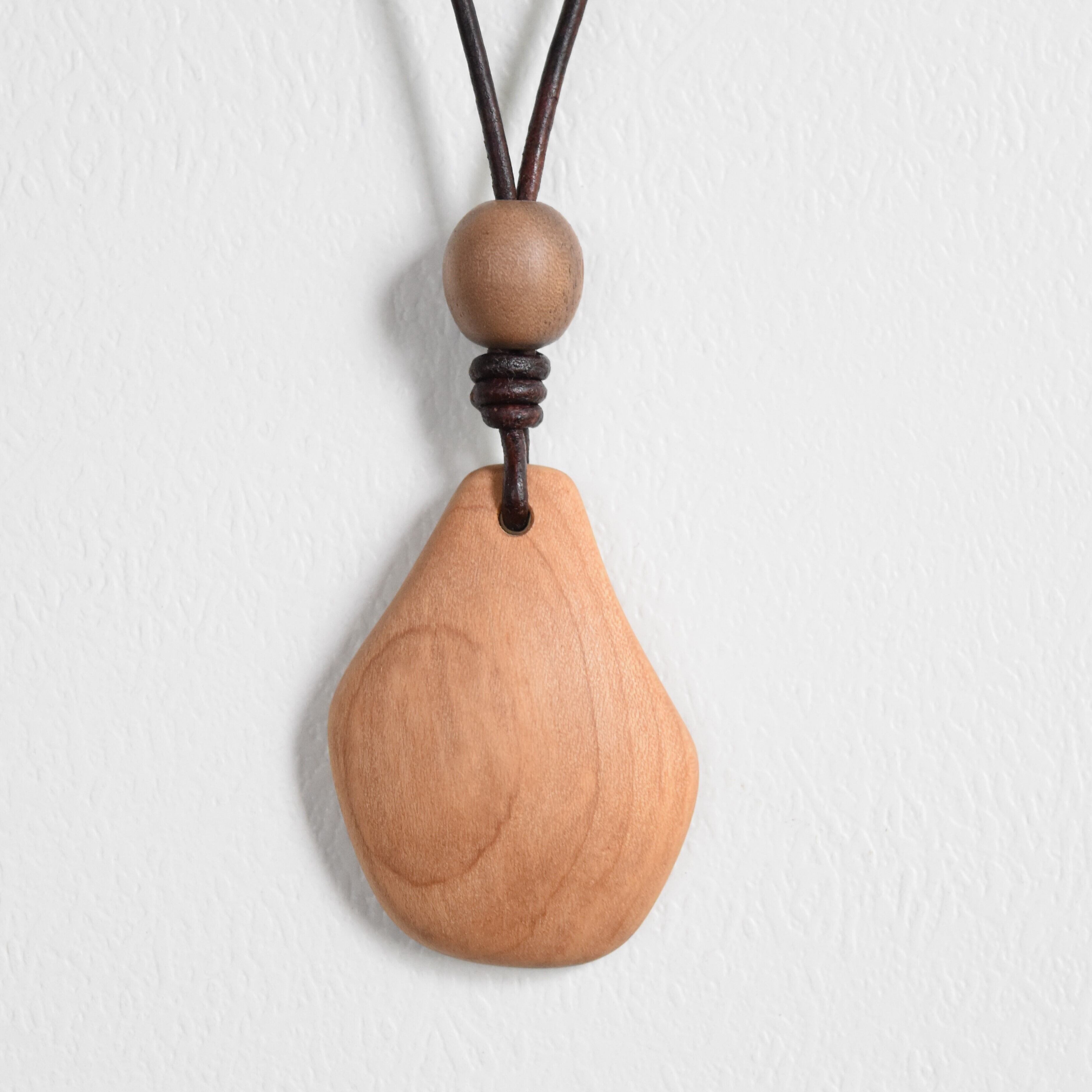 ペンダントトップは貝殻をイメージした形で、それぞれ木目がきれいに見えるように、ひとつひとつ違う形に削って作りました。