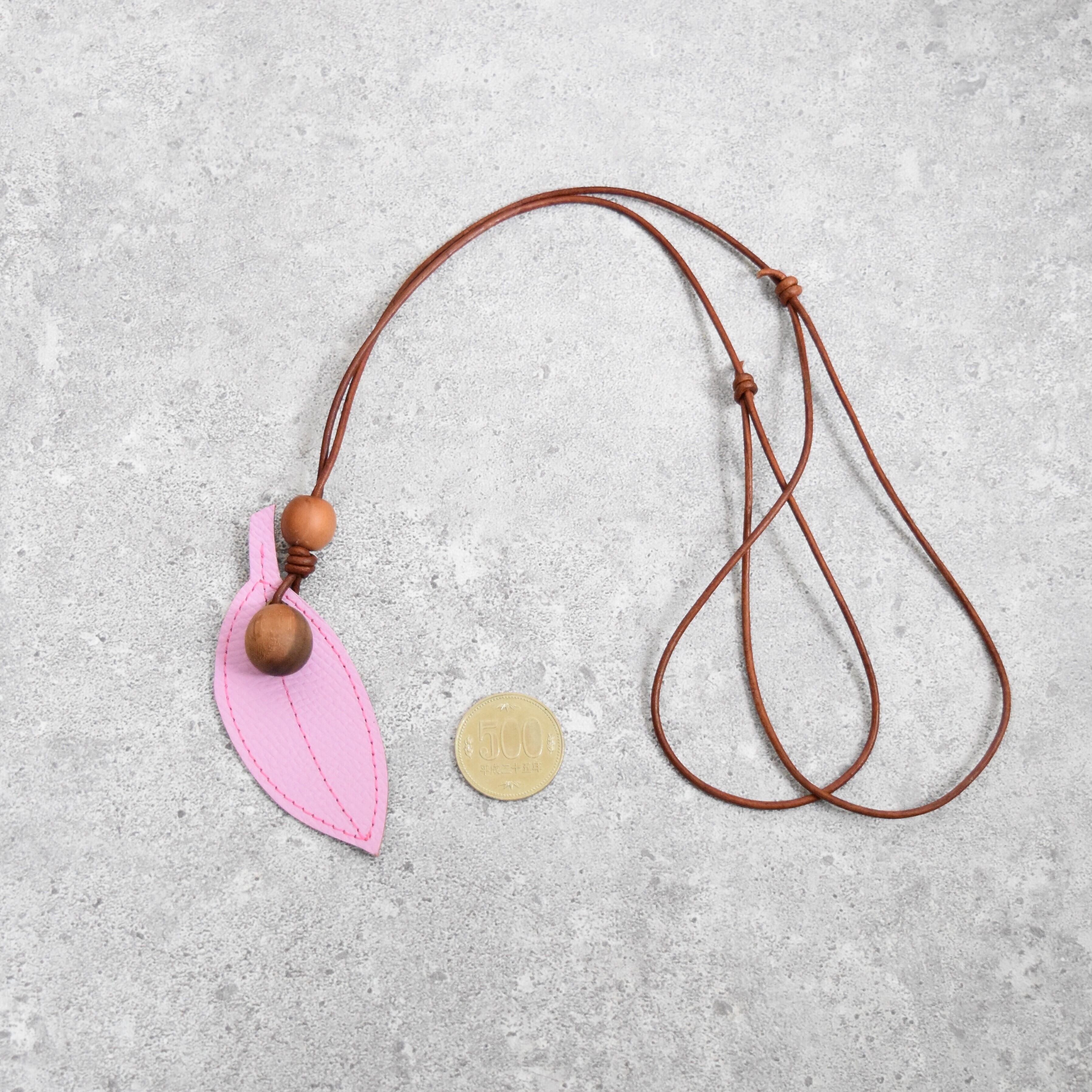 ペンダントトップにレザーの葉っぱを使用しました。これはRCW(らいちクラフトワークス)さんにお願いして作っていただいたものです。