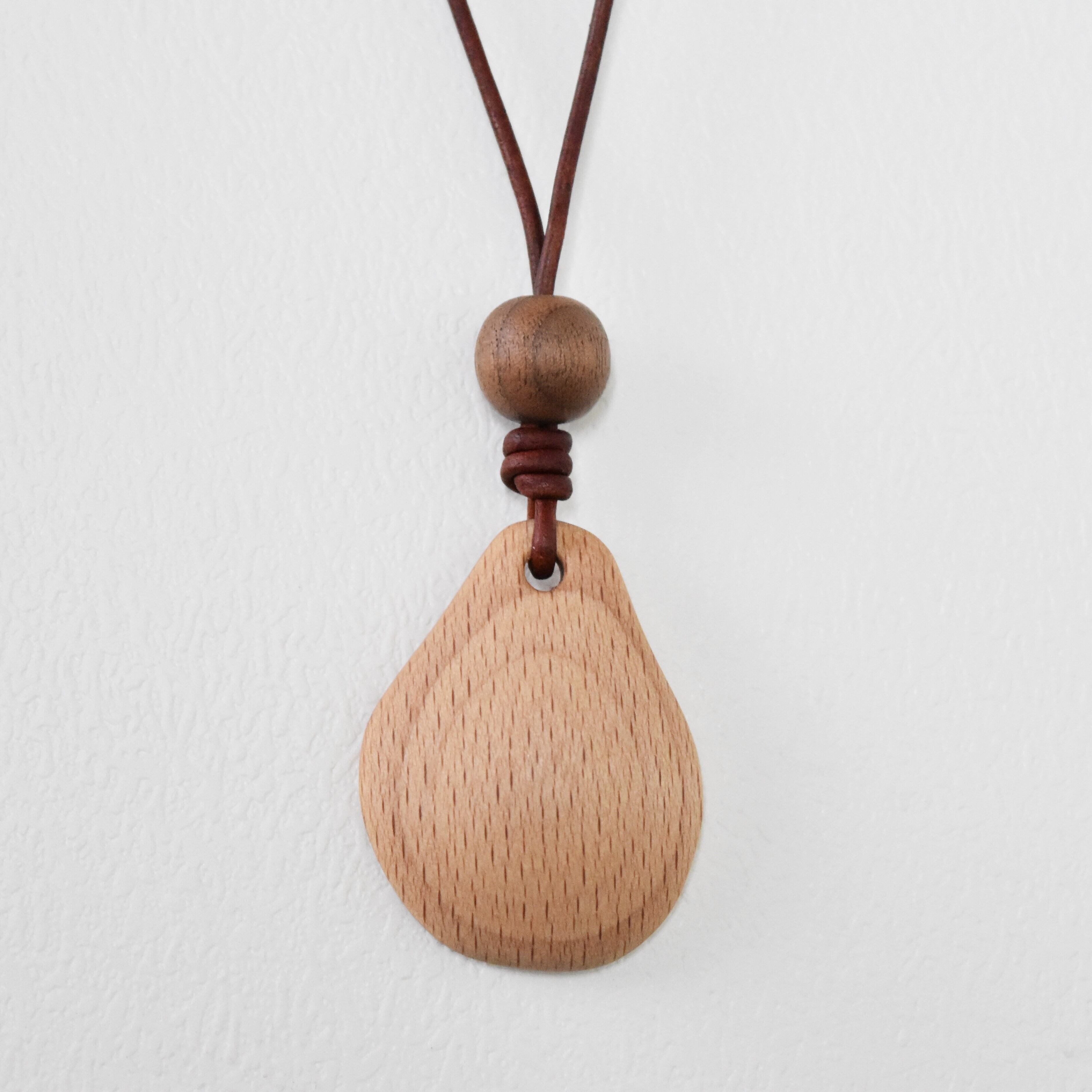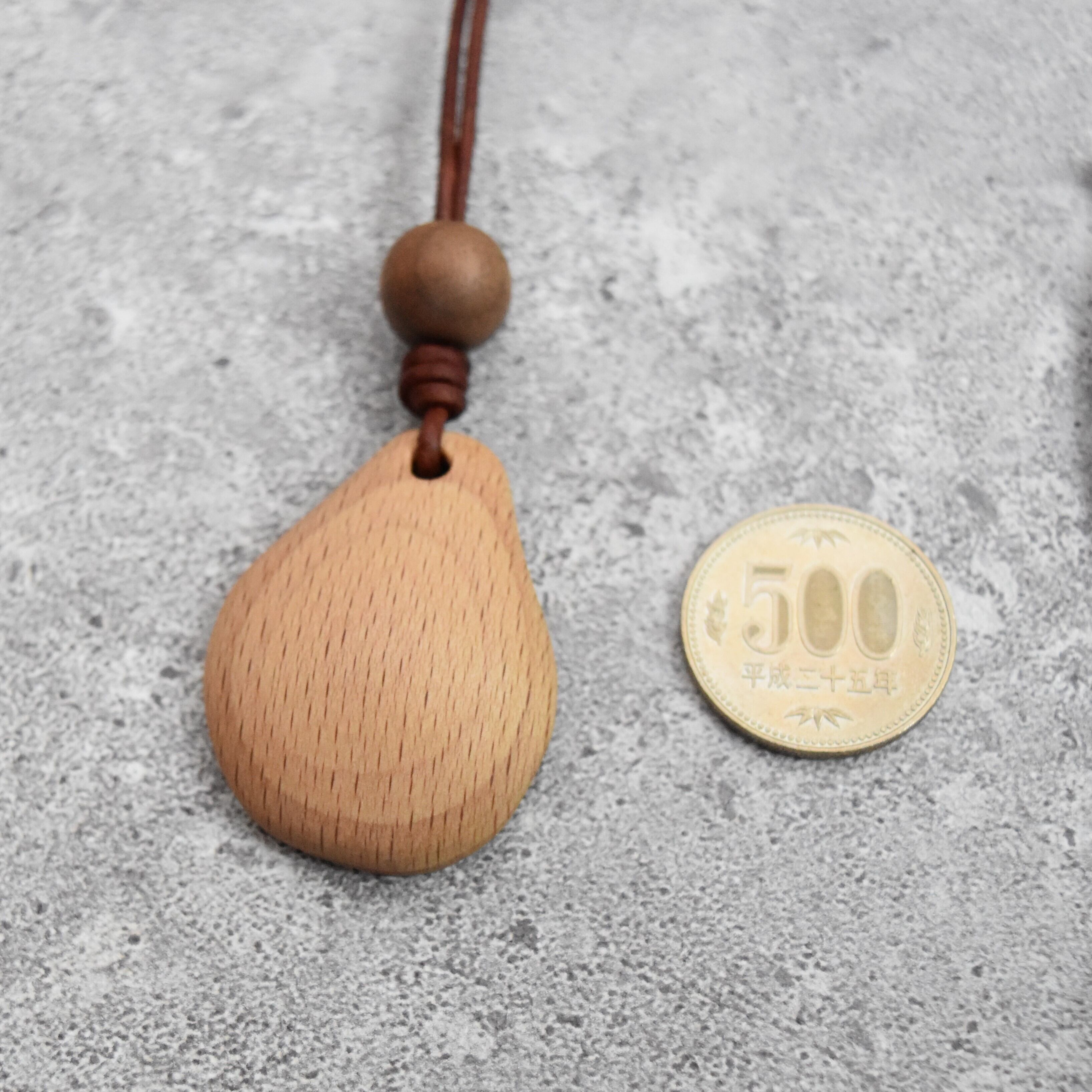 ペンダントトップは貝殻をイメージした形で、それぞれ木目がきれいに見えるように、ひとつひとつ違う形に削って作りました。