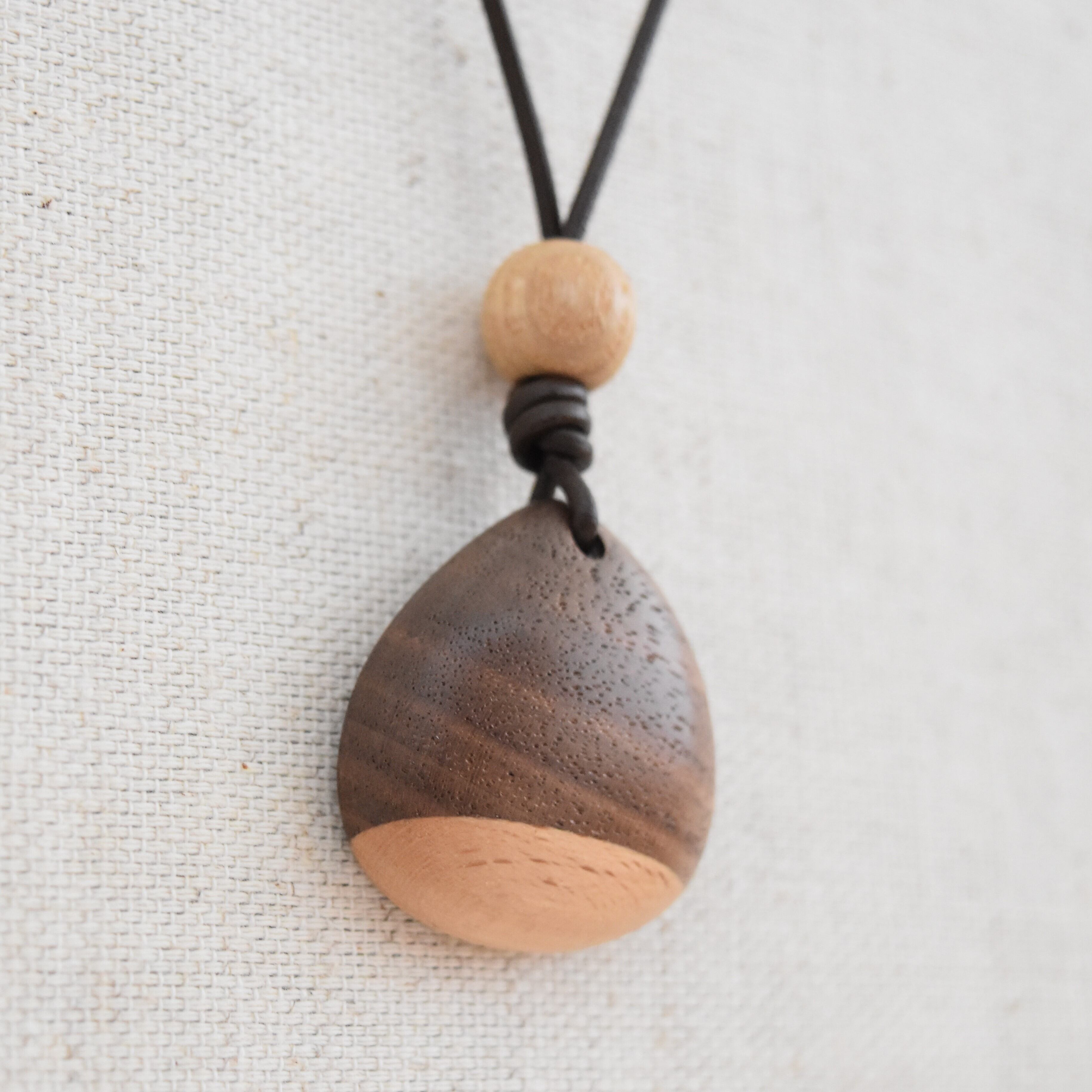 ペンダントトップは木の実をイメージした形で、色の違う木を挟んで接着しています。